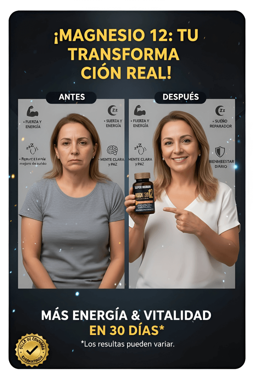 Ofrece una fórmula completa con 12 tipos de magnesio para energía, relajación y salud integral, sin efectos secundarios agresivos.