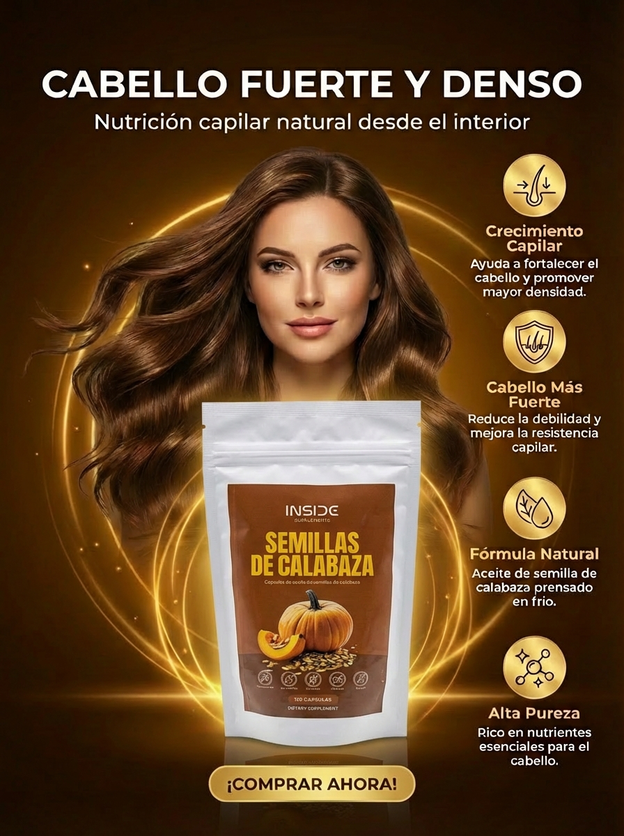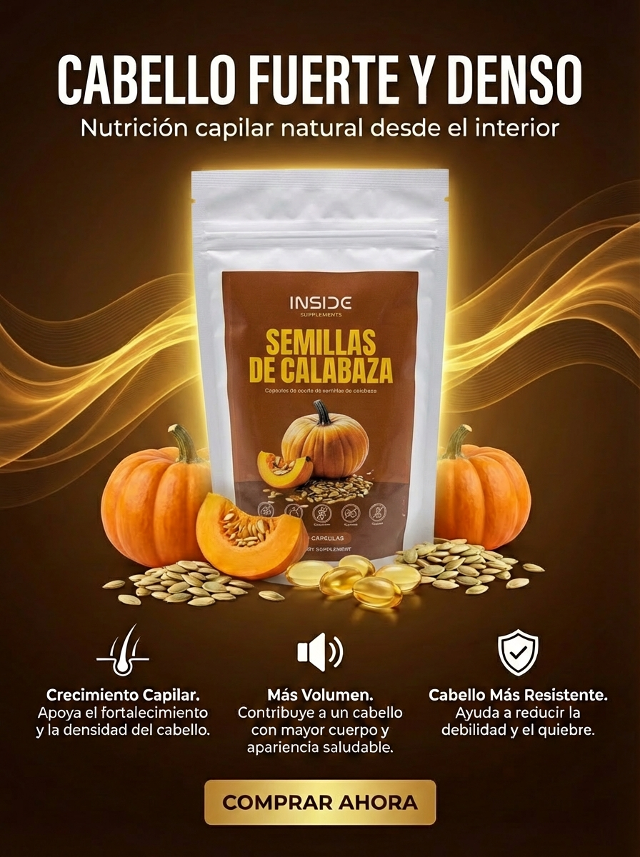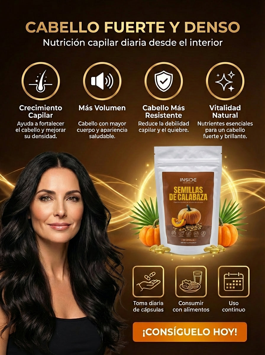 Cada cápsula aporta aceite de semilla de calabaza prensado en frío y saw palmetto, ingredientes respaldados por estudios científicos para reducir el DHT, fortalecer el folículo y estimular el crecimiento capilar.